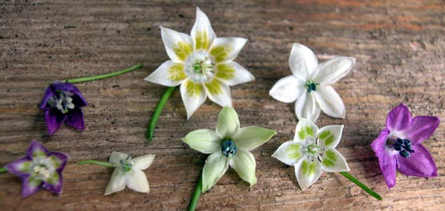 Yllä: eri chililkasvien kukkia. Väri, koko ja muoto vaihtelevat melkoisesti, samoin tuoksu. Vasemmalta: Pimenta Cumari (c.praetermissum), Ulupica (c.cardenasii.sp), Tepin (c. annuum var. glabriusculum), Aji Amarillo (c. baccatum var. pendulum), Tabasco (c. frutescens), Quintisho (c. baccatum), Assam Red (c. annuum), Bolivian Rainbow (c. sp). Kuvasta puuttuvat erikoisuuksina mm. hyvin pienikukkaiset c. chacoënset, keltakukkaiset c.rhomboideumit ja moni muu kiintoisa tuttavuus.