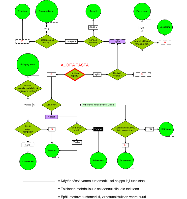 Kaava kattaa käytännössä kaikki suomessa harrastajalle mahdollisesti eteen tulevat capsicumit, merkittävimpänä poikkeuksena keltakukkaisena kaikista muista poikkeava capsicum rhomboideum. Ulkomaisista lähteistä peräisin olevien villichilien kohdalla kaavaan tulee suhtautua erittäin varauksella, sillä vaikka todennäköisyys jonkin tämän kaavan ulkopuolisen erittäin harvinaisen capsicumin osumiseen kohdallesi on pieni, se on aina olemassa. Myöskään kaikki geenipankkien tai edes tutkijoiden määritykset eivät pidä paikkaansa; esimerkkinä CGN19198 ja monet PI-luokitellut lajikkeet... Huomatkaa se, ettei kaava tunnista oikein melko yleisiä annuum-trion (annuum-chinense-frutescens) välisiä, tai muitakaan mahdollisia risteytymiä!